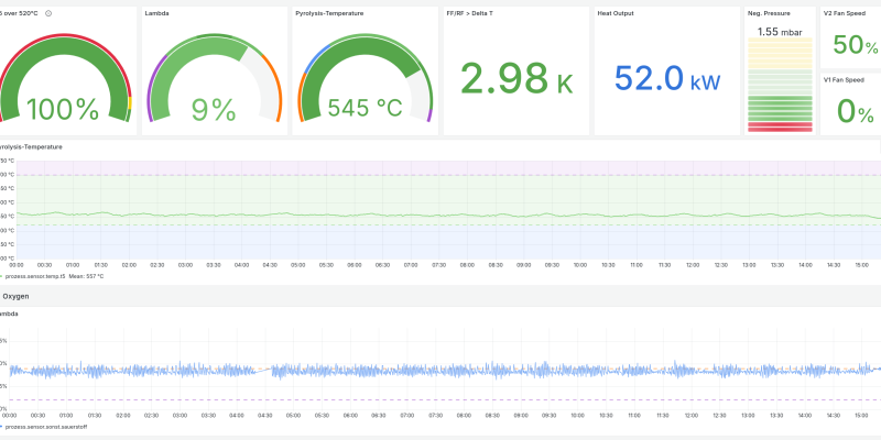 Pyrolyseheizkessel verbrennen Biomasse hocheffizient – wenn sie optimal laufen. Doch ohne kontinuierliche Überwachung bleiben Ineffizienzen unsichtbar: Zu niedrige Verbrennungstemperaturen führen zu Energieverlusten, suboptimale Sauerstoffzufuhr zu unvollständiger Verbrennung. Dieses Monitoring-System erfasst über 300 Datenpunkte pro Minute von Siemens S7 Steuerungen und überträgt sie via MQTT und SparkplugB in einen Unified Namespace. InfluxDB speichert die Zeitreihendaten, während Grafana-Dashboards Echtzeit-Visualisierung und Alarmierung bieten. Das Ergebnis: Transparente Betriebsführung, optimierte Verbrennung und zentrale Verwaltung mehrerer Anlagen über Standorte hinweg.